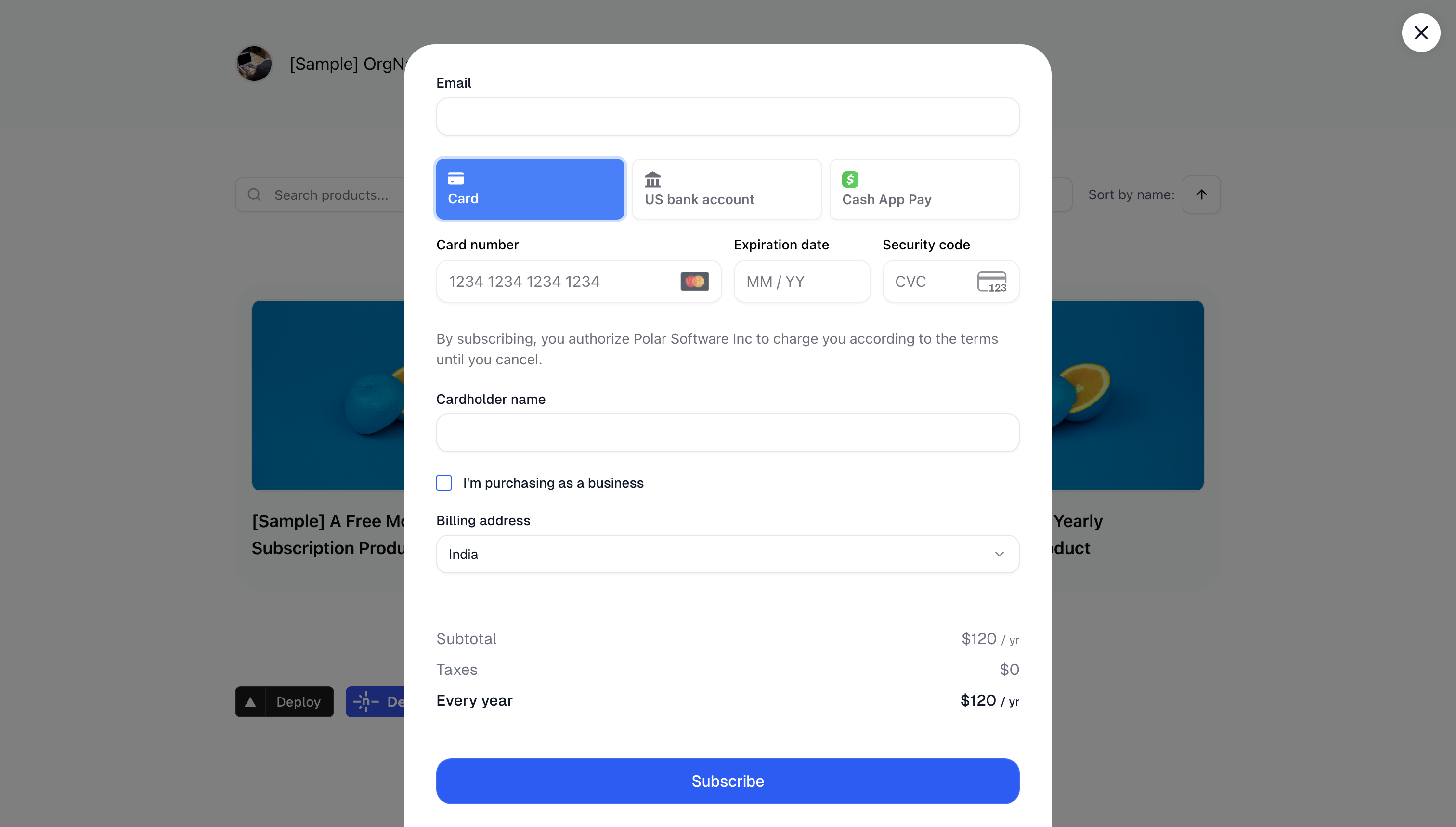 In some cases, you might need to programmatically close the checkout - for instance, if you detect that a user needs to take an action elsewhere in your application first:Enabling Wallet Payment Methods (Apple Pay, Google Pay, etc.)