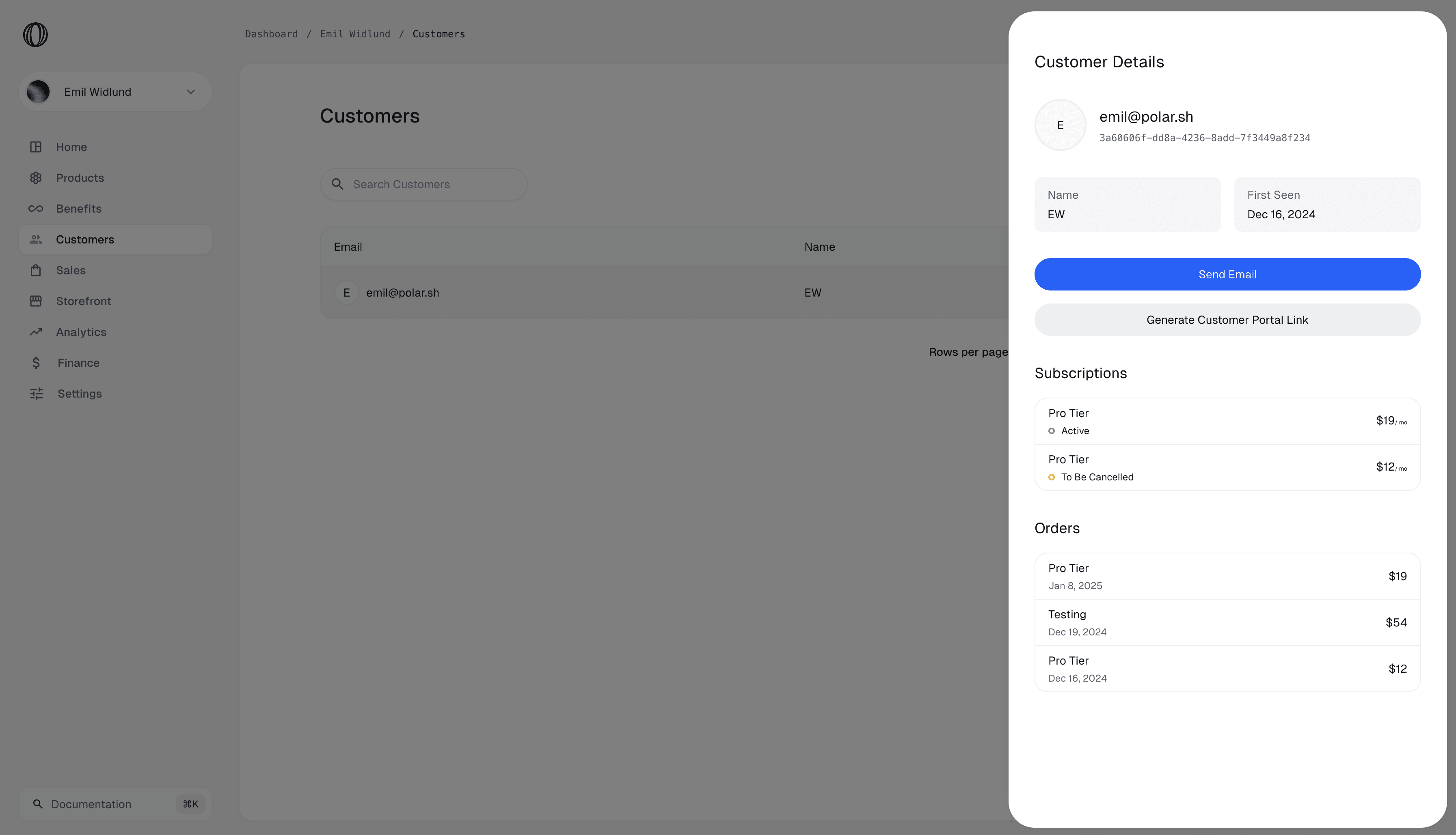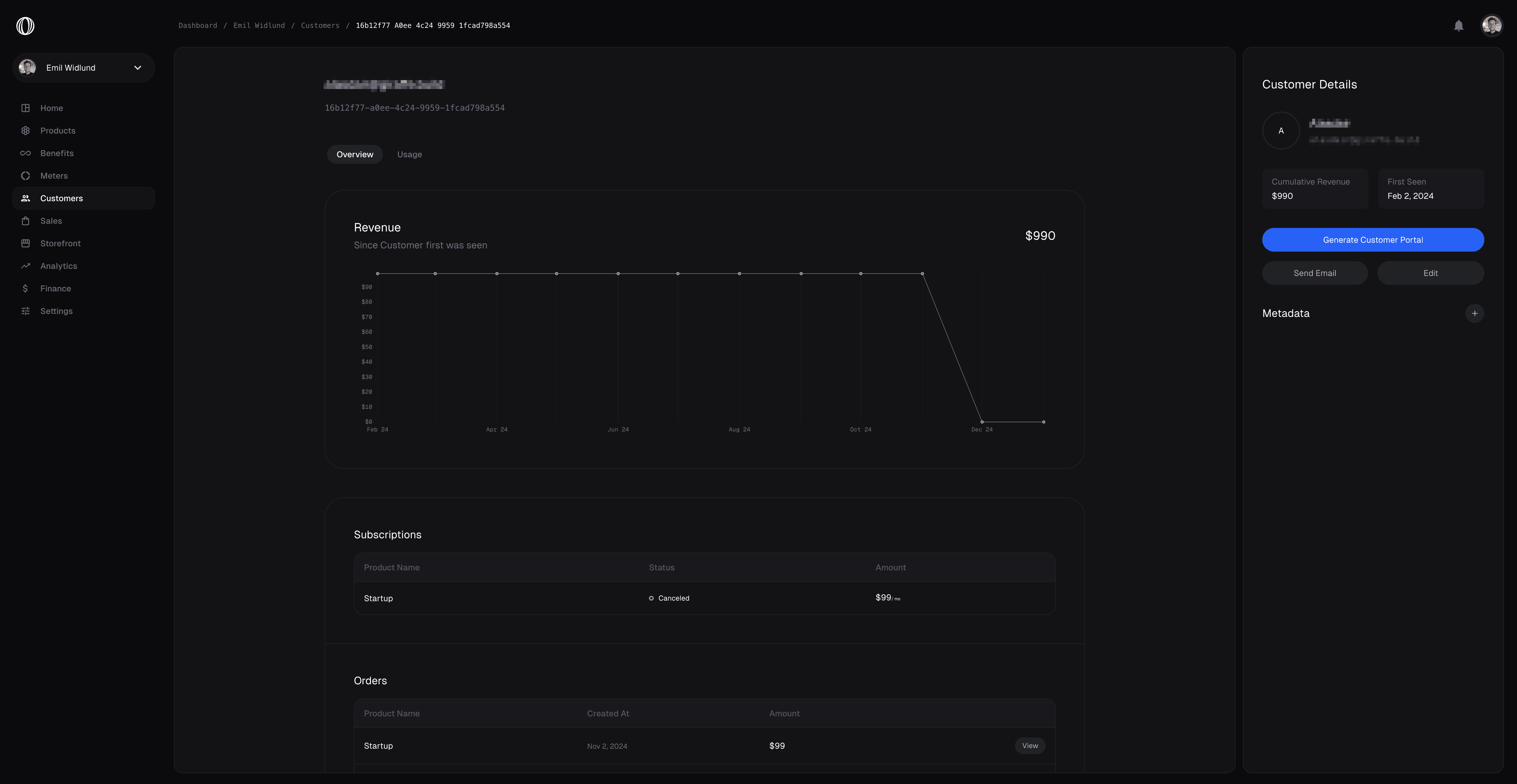 Aureon has a built in feature to view and manage your Customers. Everyone who has ever purchased something from you will be recorded as a Customer to your Organization. You’re able to see past orders and their ongoing subscriptions, as well as some additional metrics.External ID