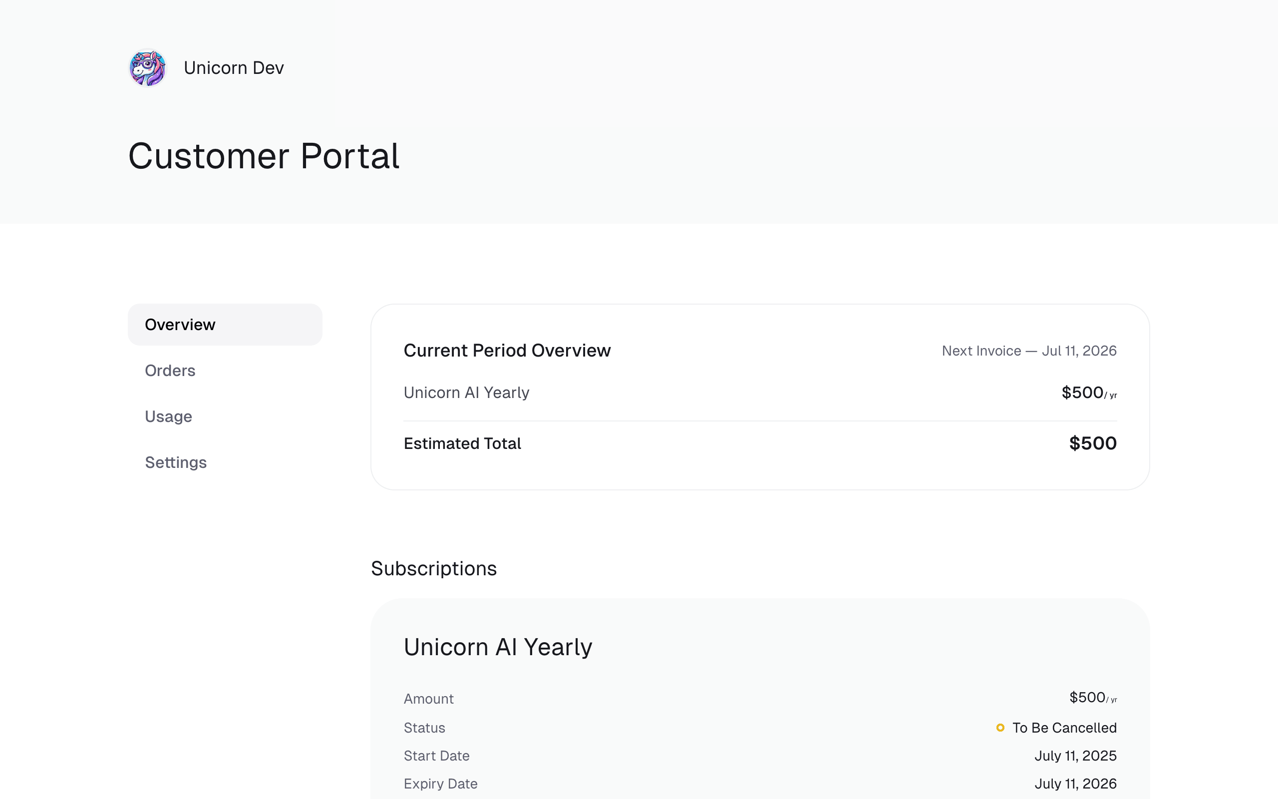 You can provide a pre-authenticated Customer Portal Link to your customers. This is handy if you want to redirect them directly from your application. Using the Aureon API, all you need is to call thecustomerSessions endpoint. Here’s an example using our TypeScript SDK.