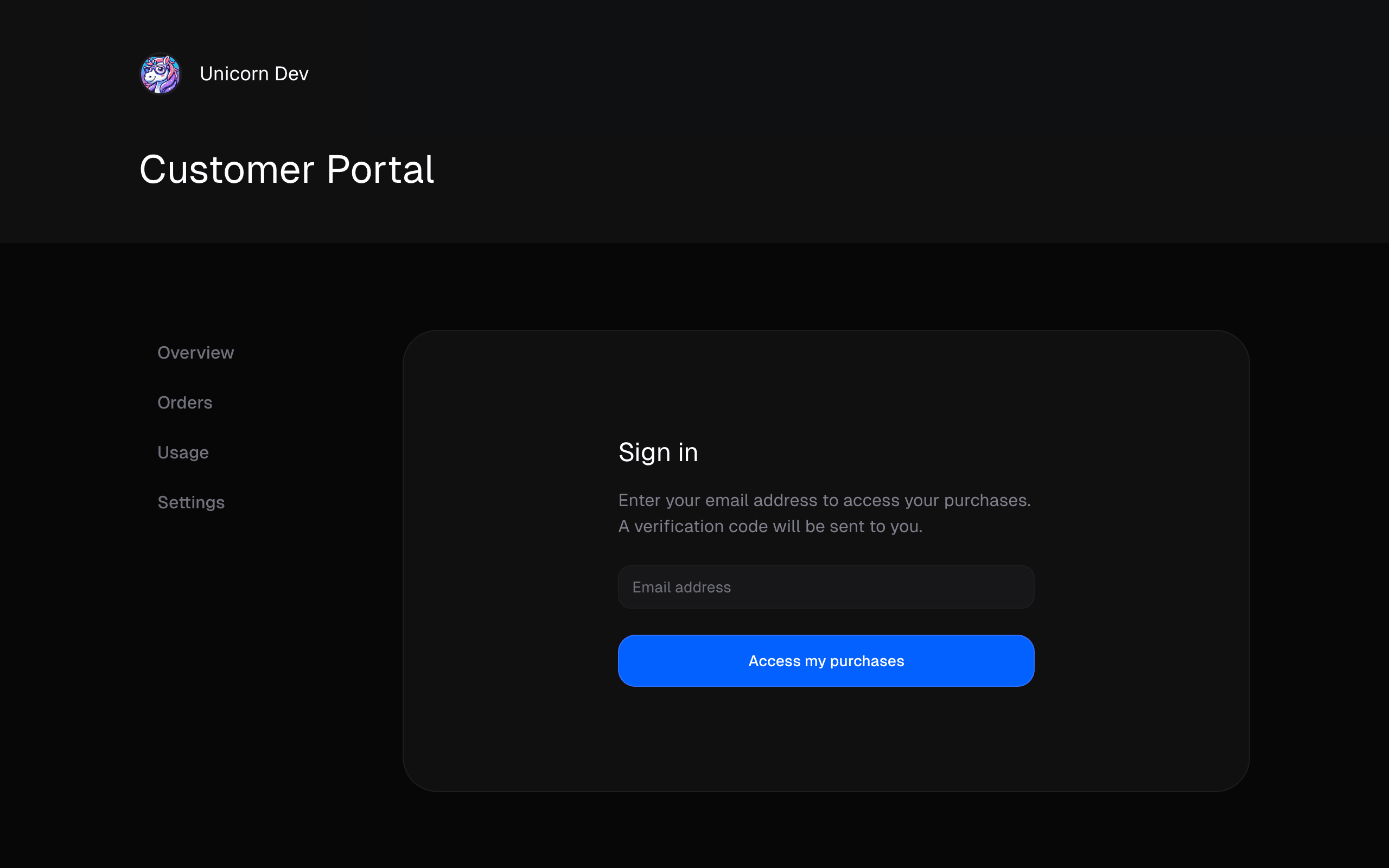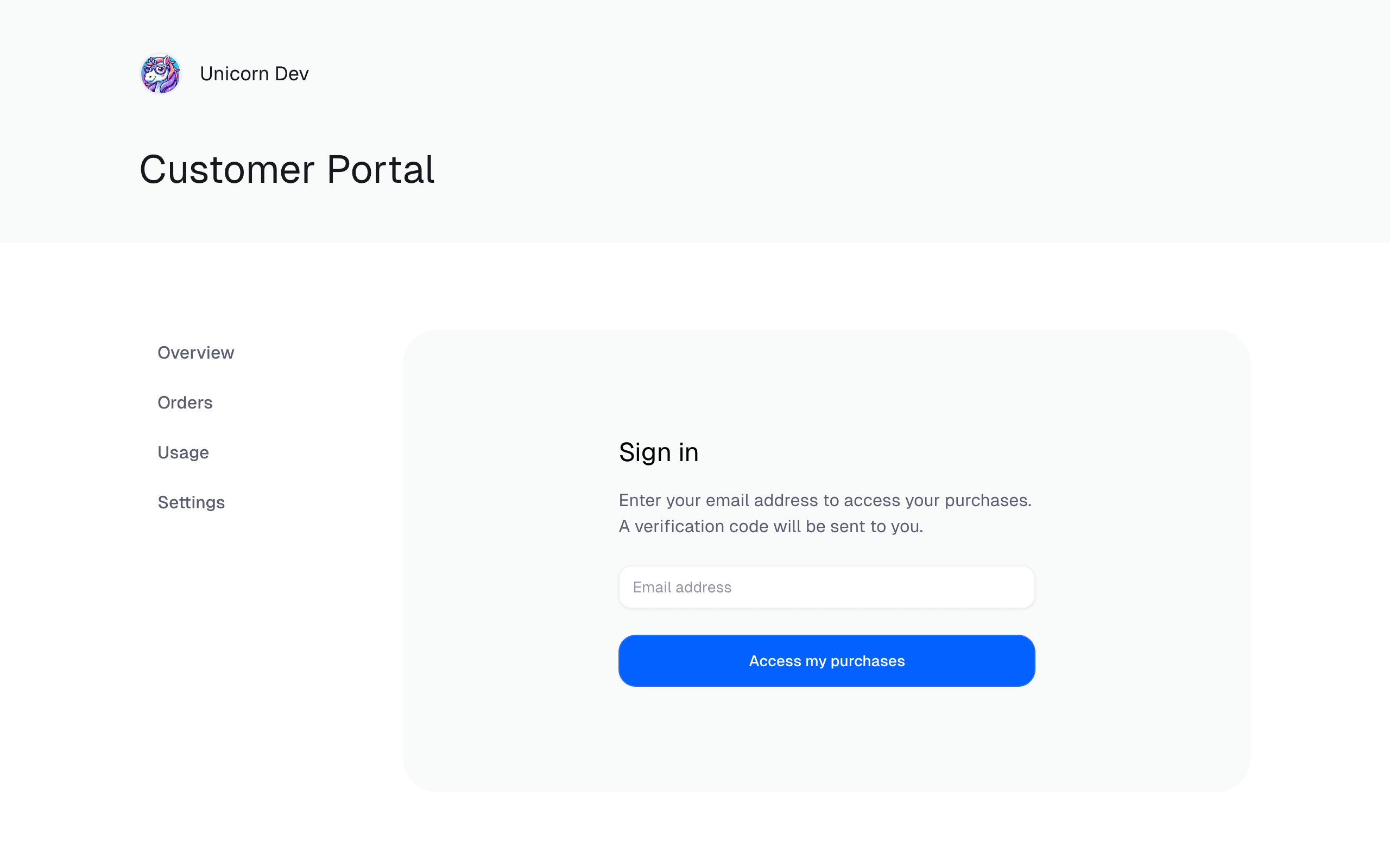 The customer portal is directly available from the URLhttps://payaureon.com/your-org-slug/portal. Your customers will be able to authenticate there by entering the email they used to purchase or subscribe to your products.