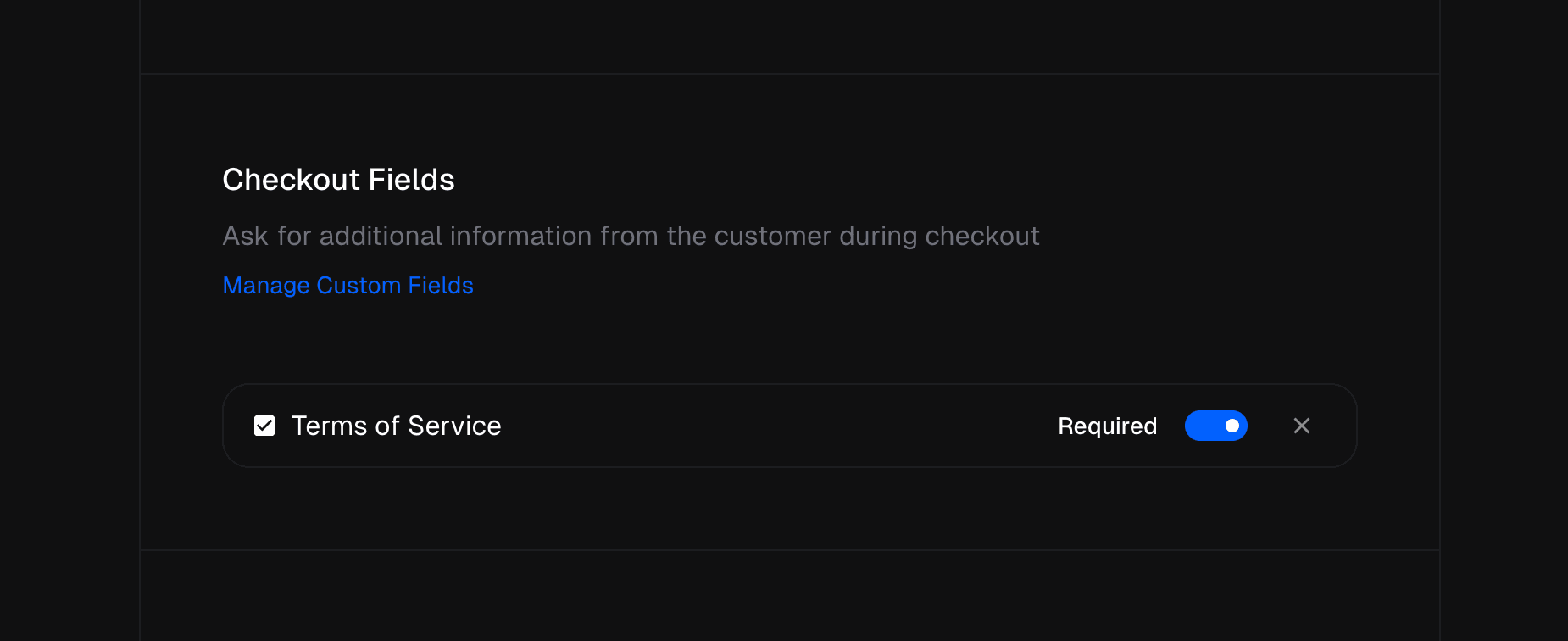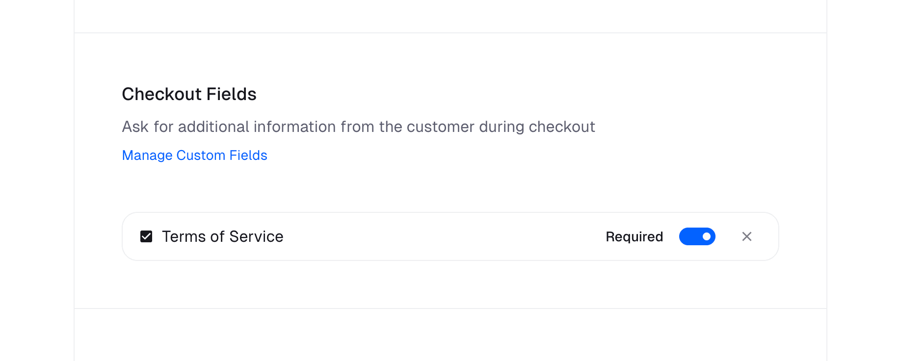 You can collect additional information from your customers at checkout. This can be useful for things like phone number, terms of service agreement or specific data you need to collect.