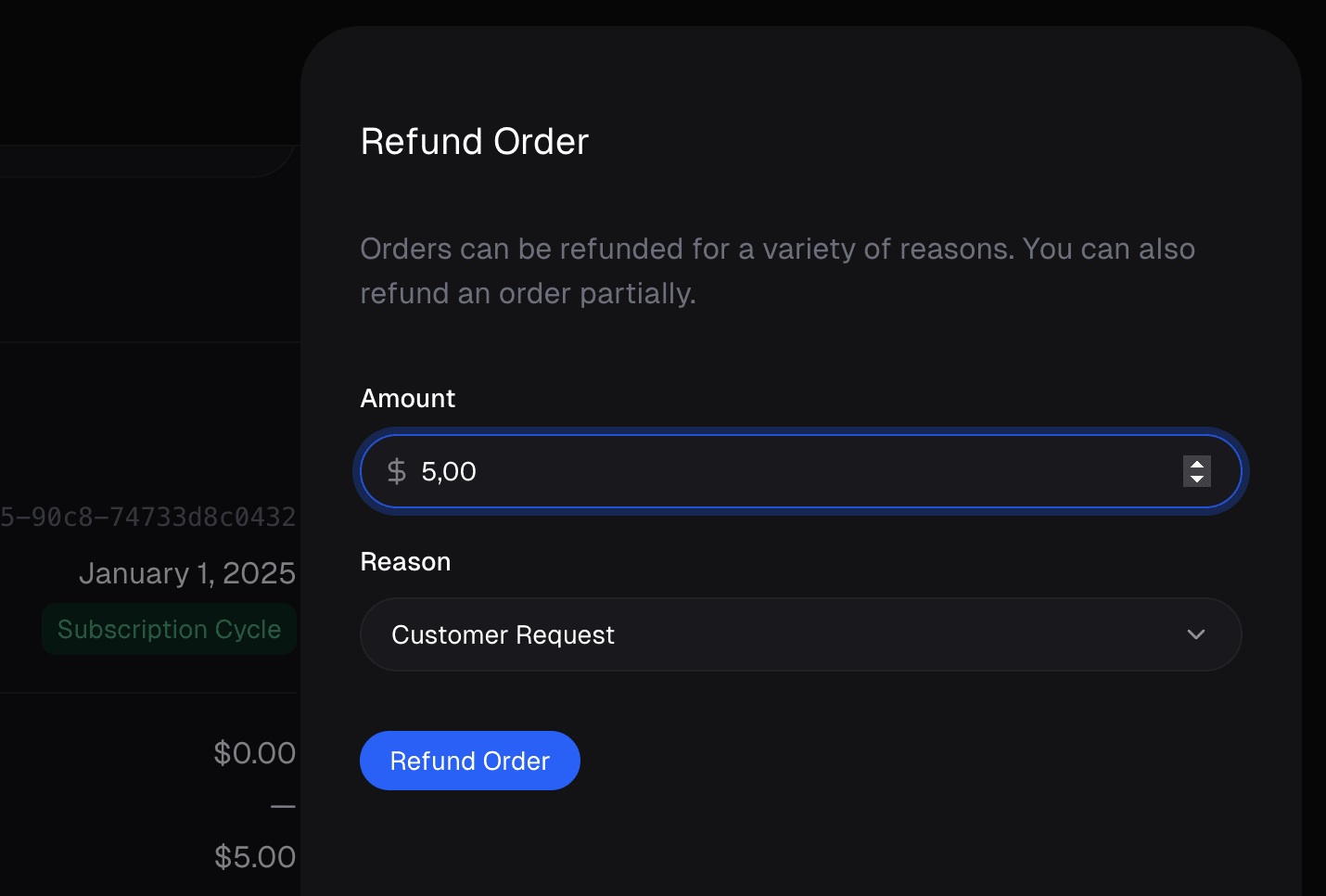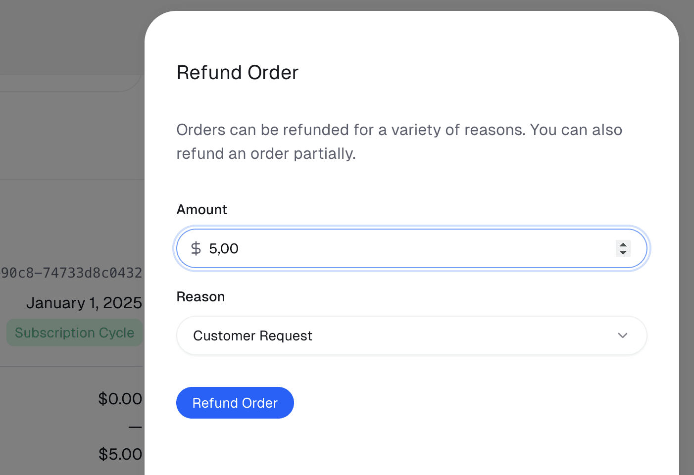 Specify the amount to refund. By default it’s the full order amount, but you can reduce this to issue a partial refund instead.
