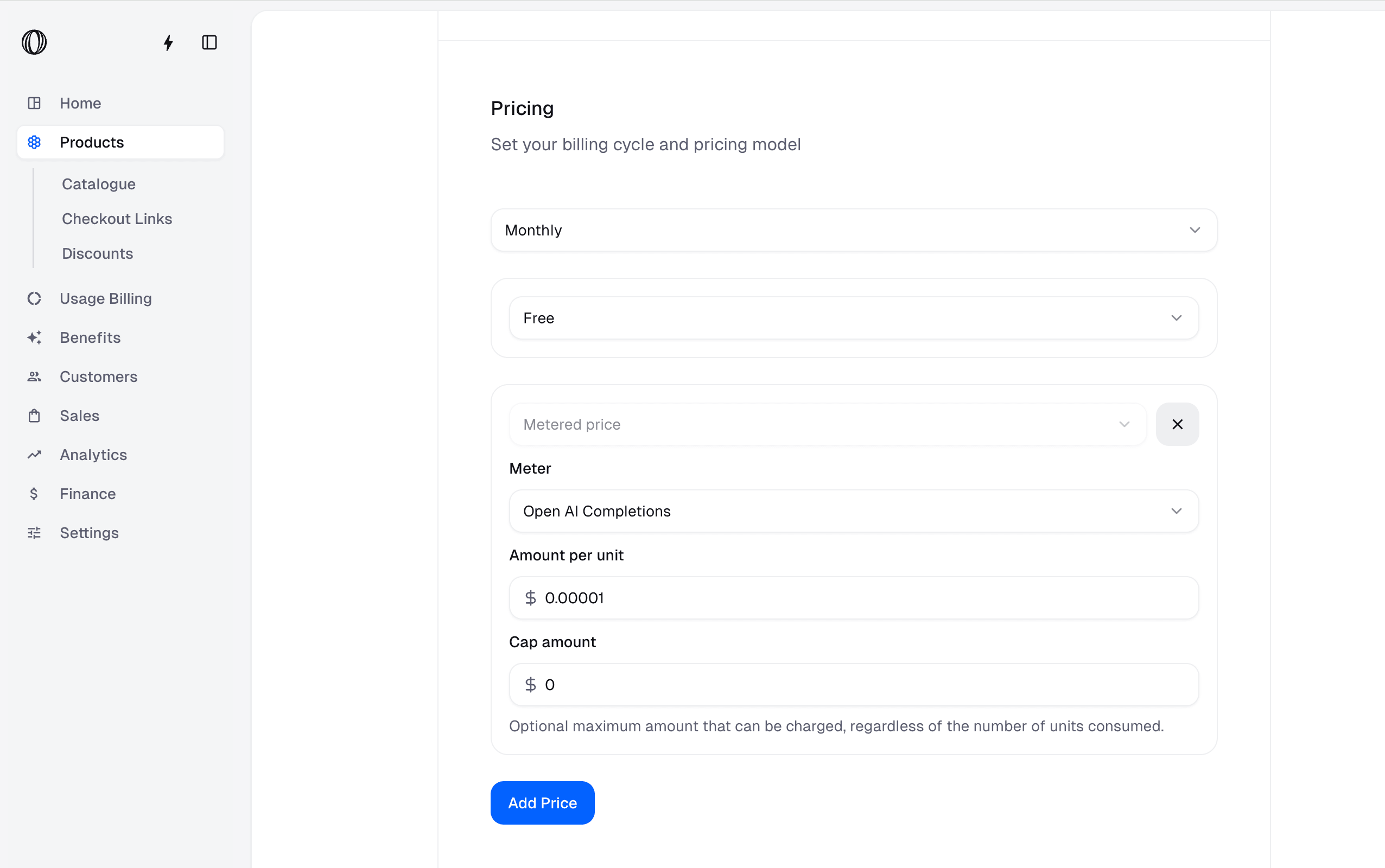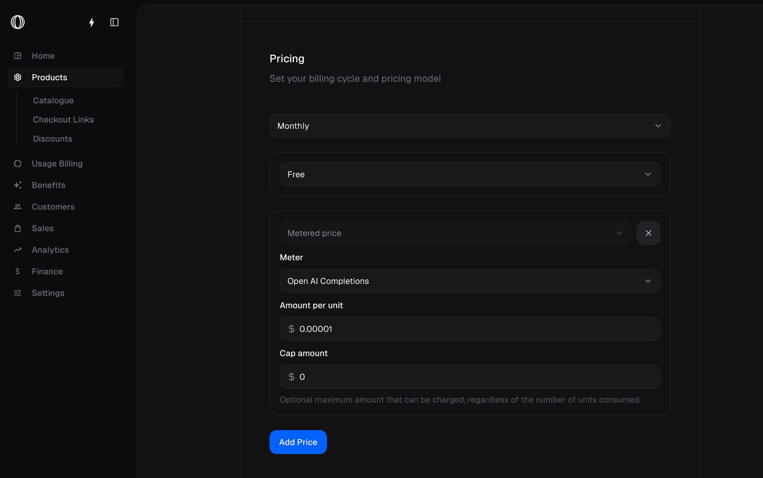 To enable usage based billing for a Product, you need to add a metered price to the Product. Metered prices are only applicable to Subscription Products.