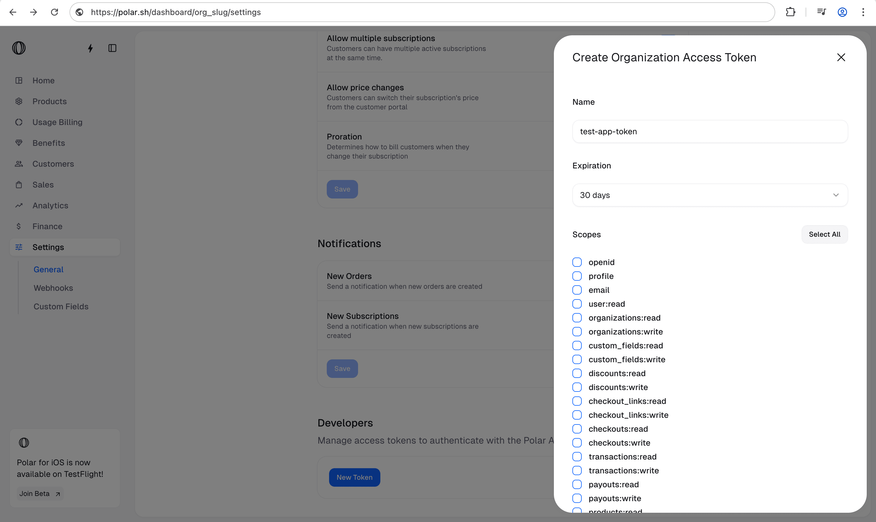 Select the required scopes: Pick the permissions your token needs.