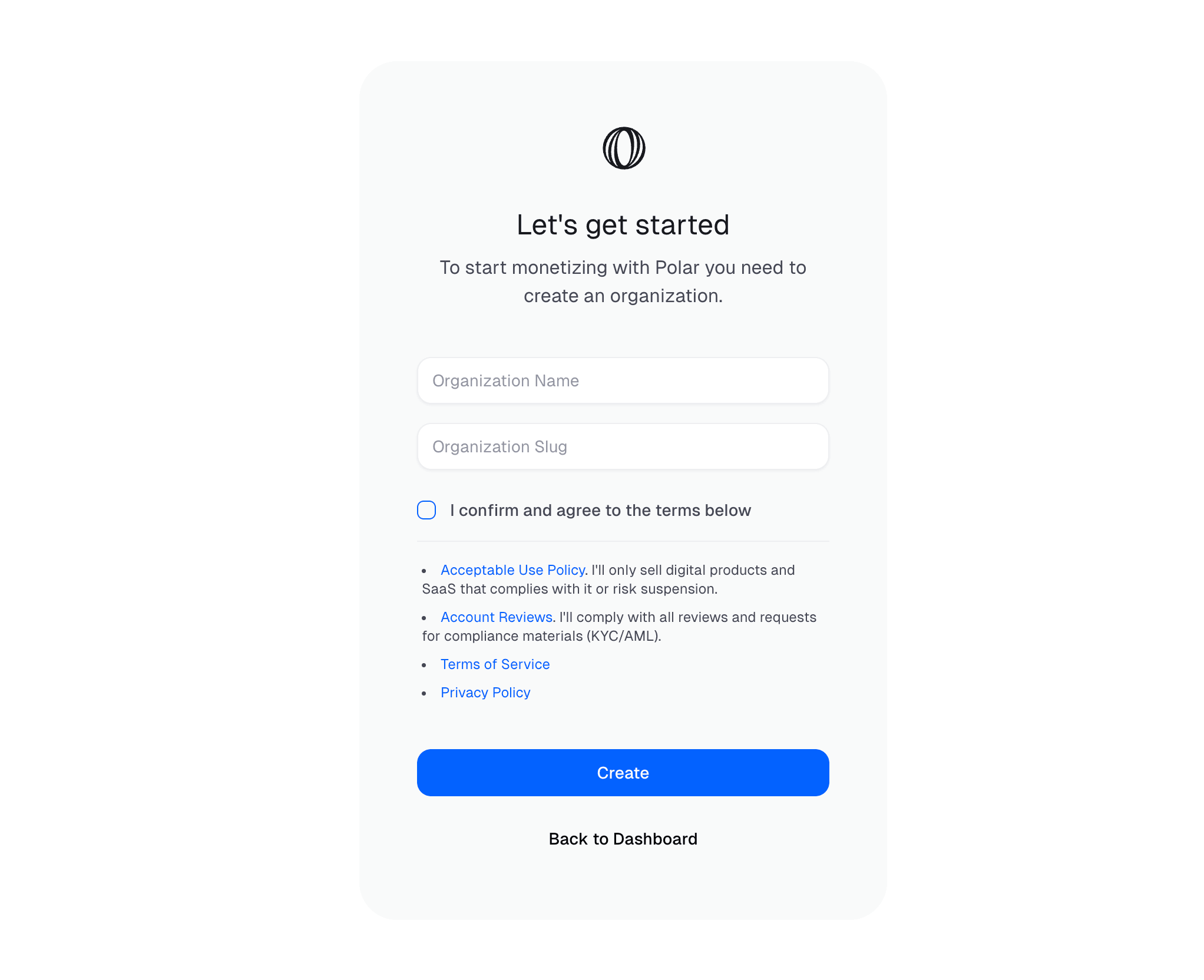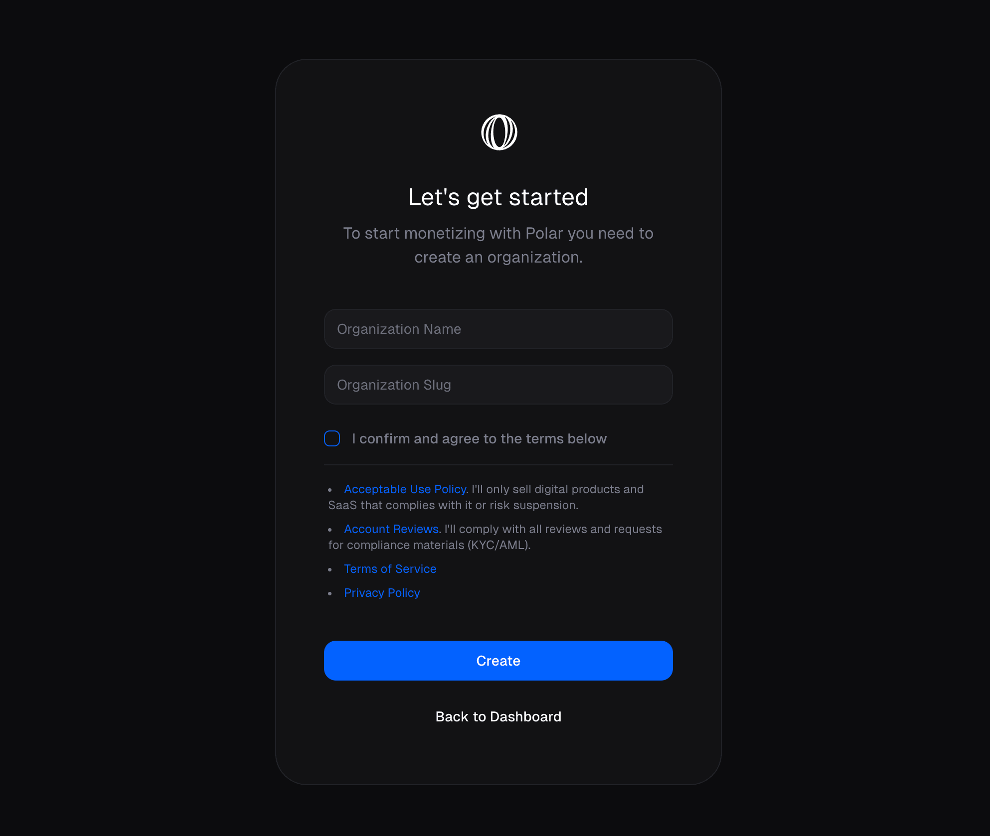 Sign up for Aureon using GitHub, Google, or email. Create an organization to manage your products and customers.